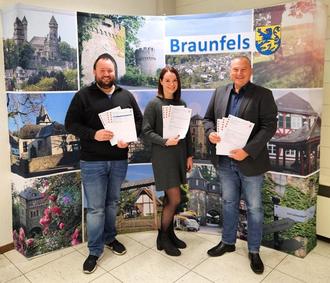 Die Förderbescheide für alle sechs städtischen Kitas sind kürzlich im Rathaus eingegangen: (v. l.) Christian Eckhardt, Fachdienstleiter Recht und Vergabe; Saskia Eckhardt, zuständig für die Kindertagesbetreuung der Stadt Braunfels und Bürgermeister Christian Breithecker. (Foto: Stadt Braunfels)