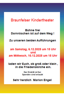 Unsere erste Aufführung findet am Samstag, 6. Dezmeber 2025, statt. Und die zweite Aufführung wird am Mittwoch, 10. Dezember 2025, jeweils um 15 Uhr, in der Friedenskirche stattfinden.