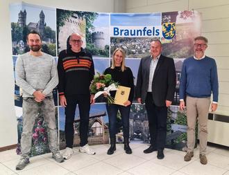 Im Rathaus wurde ein Dienstjubliäum gefeiert. Nadja Franz, Fachbereich Bau, Planung und Immobilien, ist seit 25 Jahren bei der Stadt Braunfels beschäftigt. Bürgermeister Christian Breithecker gratulierte zusammen mit Dennis Desch, Personalrat Braunfels, Jochen Datz, Fachbereichsleitung Bau- und Immobilienmanagement, sowie Klaus Schmidt, Fachbereichsleitung Finanzen und überreichte einen Blumenstrauß sowie eine Urkunde zum Jubiläum.