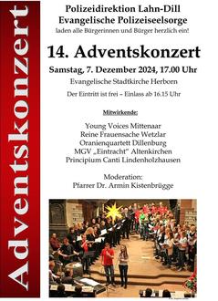 Die Polizeidirektion Lahn-Dill und die Evangelischen Polizeiseelsorge in Herborn laden alle Bürgerinnen und Bürger herzlich zum 14. Adventskonzert ein!