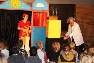 Braunfels-Bonbaden (sbe) Eine ungewöhnliche, dafür aber sehr lustige und lehrreiche Unterrichtsstunde, erlebten die 80 Kinder der Bonbadener Grundschule mit der „Prima-Klima-Show“. Auch der Ort war ungewöhnlich, denn zu Fuß ging es unter Führung der Schulleiterin und ihrem Lehrerkollegium durch das Dorf in die Mehrzweckhalle, in der Schwalbacher Straße. Hier wartete „Lakritzes Clowntheater-Prima Klima Show“ mit der Schauspielerin Sigrid Fath als Mimi Energy und dem schlauen Raben „Rüdi“ bereits auf die Kinder. Unterstützt wurden die beiden von dem gelehrten Professor „Pfiffikus“, der die gängigsten Themen rund um den Klima- und Ressourcenschutz wissenschaftlich beleuchtete und diese mit gebastelten Modellen anschaulich erklärte.