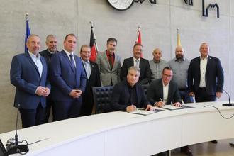 Landrat Carsten Braun und der Aßlarer Bürgermeister Christian Schwarz unterzeichneten die gemeinsame Vereinbarung des Landkreises und der Städte und Gemeinden. (Foto: Lahn-Dill-Kreis)