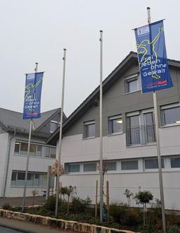 Die Flagge der Frauenrechtsorganisation „Terre des Femmes“ hängt bis Ende November vor dem Rathaus in Braunfels, um ein Zeichen gegen Gewalt an Frauen zu setzen. (Foto: Stadt Braunfels)