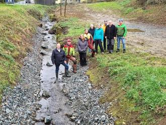 Während einer gemeinsamen Begehung machten sich die Beteiligten ein Bild von der Umsetzung: (v. l.) Bürgermeister Christian Breithecker; Marc Schöler, Baumdienste Lindenthal; Sabrina Keuser, Regierungspräsidium Gießen; Franziska Franz, Baumdienste Lindenthal; Sena Werigin, Planungsbüro Koch; Dr. Christiane Koch, Planungsbüro Koch; René Barth, Burkhard Barth Baggerbetrieb GmbH; Bernd Flick, Regierungspräsidium Gießen sowie Heinfried Obitz, zuständig für Stadtplanung und Naturschutz - Umwelt und Natur der Stadt Braunfels. (Foto: Stadt Braunfels)