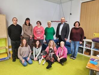 Das Team der Kita „Lindwurm“ in Tiefenbach freut sich über die tierische Unterstützung: (1. Reihe v. l.) Kurt Hartmann, Jana Wagner, Viktoria Denter, Ute Hauck (Kita-Leiterin), Bürgermeister Christian Breithecker und Julia Droß, (2. Reihe v. l.) Rebekka Waidler, Celina Schindler, Harry, Molly, Alexandra Leonhardt (Hundehalterin) und Melanie Pohl. (Foto: Stadt Braunfels)