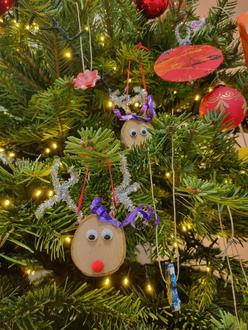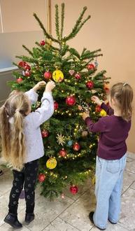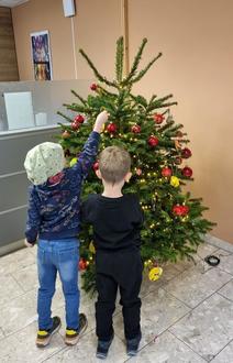 Die Erzieherinnen unterstützten die Kinder tatkräftig, indem sie ihnen die Baumdeko anreichten. Im Anschluss durften sich die Kinder als kleines Dankeschön etwas Süßes mitnehmen.