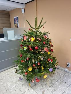 Der feritg geschmückte Tannenbaum kann ab sofort im Foyer des Rathauses bewundert werden. (Fotos: Stadt Braunfels)
