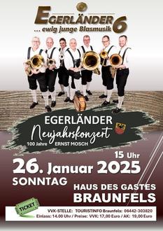 Am Sonntag, 26.01.25 heißt es im Haus des Gastes in Braunfels willkommen zum „Egerländer Neujahrskonzert“ präsentiert von 6 Musikern und einem Schlagzeuger.