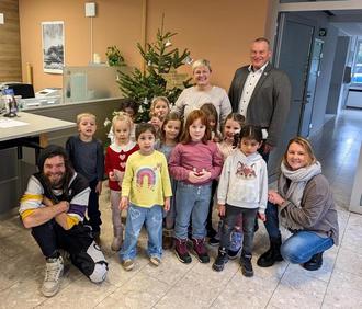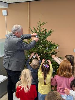 Die pädagogischen Fachkräfte und Bürgermeister Christian Breithecker unterstützten die Kinder tatkräftig, indem sie ihnen die Baumdeko anreichten. Die Kinder hatten außerdem ein Weihnachtslied einstudiert, das sie den Rathausangestellten und dem Bürgermeister nach dem Schmücken vortrugen. Im Anschluss durften sie sich als kleines Dankeschön etwas Süßes mitnehmen.