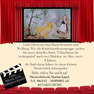 Wer von Ihnen im Raum Braunfels und Weilburg würde sein Kind gerne in einer solchen Gruppe Theater spielen lassen? Die Proben finden mittwochs von 15 - 16 Uhr in der Stadtbücherei Braunfels statt.