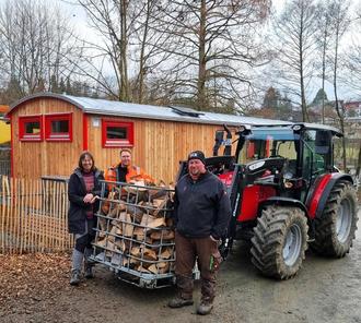 Das Kita-Team und die Kinder freuen sich über die Holzspende, die Jan Portz vergangene Woche mit einem Traktor zur Waldkita brachte. Die Kitakinder waren mit „Feuereifer“ dabei und hatten die Scheiten im Nullkommanix eingelagert.