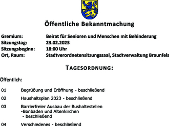| Ort, Raum: | Stadtverordnetensitzungssaal, Stadtverwaltung Braunfels |