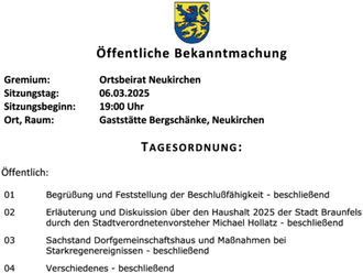 | 02 | Erläuterung und Diskuission über den Haushalt 2025 der Stadt Braunfels durch den Stadtverordnetenvorsteher Michael Hollatz - beschließend |