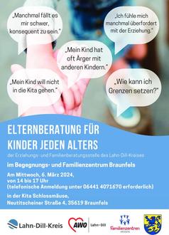 Die Erziehungs- und Familienberatungsstelle des Lahn-Dill-Kreises bietet am Mittwoch, 6. März 2024, zwischen 14 und 17 Uhr, wieder einen Beratungstag für Eltern an. Die Veranstaltung findet im Begegnungs- und Familienzentrum Braunfels, in der Kita Schlossmäuse (Neutitscheiner Straße 4, 35619 Braunfels) statt.