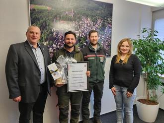 Im Braunfelser Rathaus überbrachte Bürgermeister Christian Breithecker (l.) Forstwirtschaftsmeister Jan Hubertus Müller (2. v. l.) gemeinsam mit Revierförster Roland Klemm (2. v. r.) und Fachdienstleiterin Personalservice der Stadt Braunfels, Julia Pflaum (r.) ein Präsent und die besten Glückwünsche zur bestandenen Prüfung. (Foto: Stadt Braunfels)