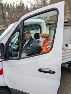 Bürgermeister Christian Breithecker begutachtet das Cockpit des neuen Sprinters gemeinsam mit Bauhofleiter Steffen Portz. (Foto: Stadt Braunfels)