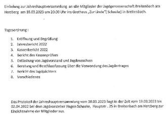 Einladung zur Jahreshauptversammlung Jagdgenossenschaft Breitenbach