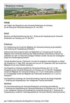 Beratung und Beschlussfassung über den Antrag der Fraktion des Bürgerforums Herzberg der Gemeindevertretung der Gemeinde Breitenbach am Herzberg zur 1. Änderung der Hauptsatzung der Gemeinde Breitenbach am Herzberg vom 19. Mai 2011
