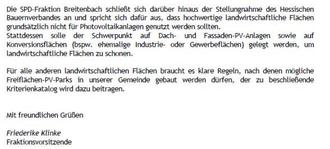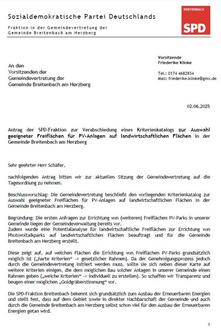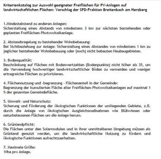 Beratung und Beschlussfassung über den Antrag der SPD-Fraktion zur Aufstellung eines Kriterienkataloges zur Bestimmung von Standorten für die Errichtung von Photovoltaikanlagen und Windenergieanlagen in der Gemeinde Breitenbach am Herzberg.