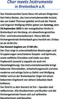 in der evangelischen Kirche in Breitenbach am Herzberg. ein abwechslungsreiches Chor- und Instrumentalkonzert. Hierzu lädt die Kirchengemeinde Breitenbach ganz herzlich ein. Einlass ist ab 16:30 Uhr.