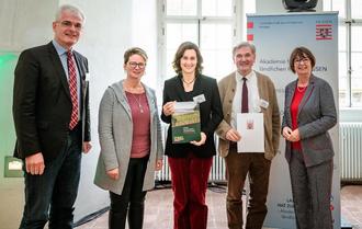 Nahmen den Anerkennungsbescheid von Umweltministerin Priska Hinz (rechts) entgegen (v.l.n.r.) Landrat des Landkreises Hersfeld-Rotenburg Torsten Warnecke, Kerstin Knoch und Katrin Anders (Regionalmangement), Walter Glänzer, Vorsitzender des Vereins zur Regionalentwicklung im Knüllgebiet e.V. © Copyright ALR, Foto: Katrina Friese