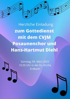 | 10:30 Uhr | Gottesdienst in der Ev. Kirche Erdbach mit dem CVJM Posaunenchor und Hans-Hartmut Diehl |