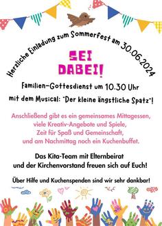| 10:30 Uhr | Gemeindefest mit der Kita und dem Musical: „Der kleine ängstliche Spatz“ |