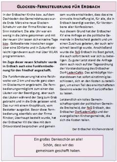 | 10:30 Uhr | Kirchspielgottesdienst in der Ev. Kirche Schönbach mit Pfarrerin Susanne Klein-Gessner |