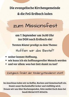 | 14:00 Uhr | Missionsfest im Dorfgemeinschaftshaus Erdbach mit Torsten Küster und dem CVJM Posaunenchor und anschließenden gemeinsamen Kaffeetrinken |