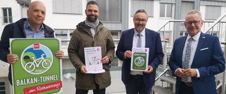 HAIGER/Breitscheid (öah/rst) – Jetzt ist die Katze aus dem Sack: Der 1114 Meter lange Radwegetunnel zwischen Langenaubach und Breitscheid (bzw. Medenbach) wird „Balkan-Tunnel“ heißen. Die Bürgermeister Roland Lay (Breitscheid) und Mario Schramm (Haiger) zeichneten jetzt die Gewinner des Logo-Wettbewerbs aus, der sehr gut angekommen war. 20 Einsendungen landeten in den beiden Kommunen - letztlich setzte sich mit Renee Eichler ein gelernter „Werbe-Mann“ durch. Sein Logo mit dem „Balkan“ fand die meiste Zustimmung bei der Tunnel-Eröffnung im August.