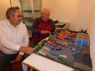 Klaus Bott erklärt Bürgermeister Roland Lay einen Teil seiner Modellauto-Sammlung.