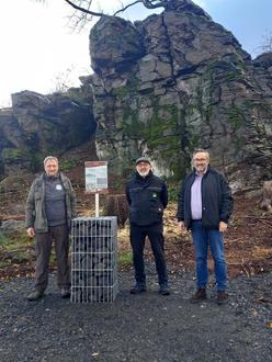 Bild v. l. Michael Volkwein (Geopark WLT), Wegepate Westerwaldsteig Dirk Grohall, Bürgermeister Roland Lay