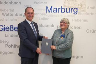 Regierungspräsident Dr. Christoph Ullrich überreicht Luise Böttcher aus Großen-Buseck den Hessischen Verdienstorden.