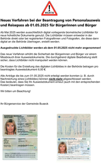 Ab Mai 2025 werden ausschließlich digital vorliegende biometrische Lichtbilder für neue hoheitliche Dokumente genutzt. Die Lichtbilder müssen entweder in der Behörde direkt oder bei registrierten Fotografinnen und Fotografen, die diese dann digital an die Behörde übertragen, erstellt werden.