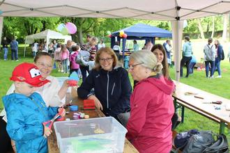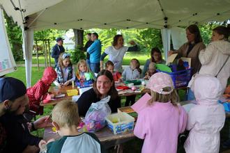 Für die Spielleute der Busecker Schlossremise (Leitung Matthias Schulze) bedeutete der Regen einen schnellen Umzug. Sie brachten ihre Instrumente in die Remise, die bei ihrem Auftritt bis auf den letzten Platz besetzt war. Noch unbesetzte Stühle gab es in der Schlosskapelle, wo Aktive vom Heimatkundlichen Arbeitskreis Buseck zwar keine Trauungen vornehmen, aber über die wechselvolle Geschichte berichten konnten. Gut vorbereitet gingen die teilnehmenden Kindertagesstätten (St. Elisabeth, Wundertüte und Pusteblume) in das Fest. Zum Glück gab es einige sonnige Abschnitte, in denen ihre Angebote freudig angenommen wurden.