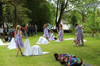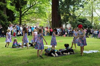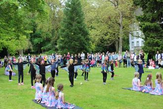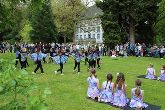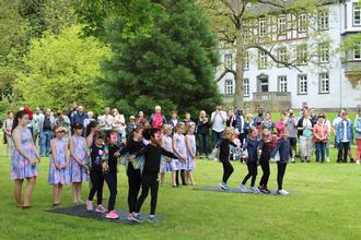 Die 15 großen und 16 kleinen Tanzmäuse vom Turnverein Großen-Buseck (Leitung Patricia Pavelic und Birgit Eichhöfer) eröffneten das 13. Frühlingsfest des Freundeskreises Busecker Schlosspark noch im trockenen Gras. Danach musste improvisiert werden. Die Frühlingselfen hatten gerade die letzten „Schneereste“ zum Schmelzen gebracht, auch gelang es ihnen, noch rechtzeitig die „Schmetterlinge“ hervorzulocken, als nach den Ansprachen von Ehrenbürgermeister und zugleich Vereinsvorsitzenden Erhard Reinl sowie Bürgermeister Michael Ranft der erste von mehreren heftigen Regengüssen herniederging. Daher „unbeabsichtigt“ testete das Männerquintett „Handvoll“ die hervorragende Akustik im Torbogen des erstmals in 1458 erwähnten ehemaligen Wasserschlosses. Leider kamen nur wenige Besucher in den Genuss dieser Darbietung, da die meisten im großen Saal des Kulturzentrums Schutz vor dem Regen gesucht hatten.