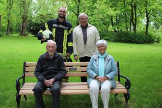 Erika und Walter Volk aus der Kaiserstraße haben anlässlich ihres 85. und 90. Geburtstags in 2022/2023 eine hochwertige Bank im Wert von knapp 800 Euro und eine Spende in Höhe von 500 Euro getätigt. Enkelsohn Jonas, zugleich stellvertretender Vorsitzender des Fördervereins der Freiwilligen Feuerwehr Großen-Buseck, trug auf Wunsch der „Presse“ zum Ortstermin Einsatzkleidung. Damit sollte der Bezug zur Geldspende hergestellt werden, die in die Anschaffung eines elektrischen Rettungsgerätes floss. Das Kombigerät, bestehend aus Spreizer und Schere, belastet die Vereinskasse mit immerhin rund 8000 Euro. Da kam die Spende wie gerufen.