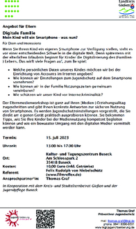 Der Elternmedienworkshop ist ganz auf Ihren (Medien-) Erziehungsalltag zugeschnitten und gibt Ihnen konkrete Antworten zur sicheren Nutzung von Smartphones. Es werden Jugendschutzeinstellungen vorgestellt, die Sie direkt am eigenen Gerät praktisch ausprobieren können. Sie bekommen Tipps, wie Sie Ihre Kinder bei der Mediennutzung kompetent begleiten können und wie ein bewusster Umgang mit den digitalen Medien vermittelt werden kann.