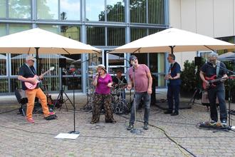 „Tyff - Die älteste Nachwuchsband Deutschlands“ rockte den Schlosspark in Großen-Buseck. „Warum der Zusatz?“ - „Weil wir immer noch nicht entdeckt worden sind“, beantwortete Gitarrist Martin Bandt augenzwinkernd die Frage. Bei einem Blick auf die Homepage der Band merkt man schnell, dass sich die Musiker gern selbst auf die Schippe nehmen. Hier ist zu lesen, dass ihre Sängerin Marta de la Vega von einem arabischen Fürsten entführt und später gegen 30 Kamele und ein gebrauchtes iPhone freigekauft werden konnte und dass es Bassist Michael Muth ungemein genießt, vor mehr als 50 Leuten zu spielen. Am frühen Donnerstagabend waren es bei bestem Open-Air-Wetter mehr als doppelt so viele. Welch ein Genuss! Und zwar auf beiden Seiten. Schlagzeuger Georg Victor wohnt in Beuern, er hatte die Idee, sich bei der Gemeinde für einen Auftritt bei „Musik im Park“ zu bewerben. Walter Hauschild an der Gitarre komplettiert die Band, die unter verschiedenen Namen seit über vier Jahrzehnten Musik macht. Bemerkenswert: Das fast zweistündige Programm wurde ausschließlich mit eigenen Kompositionen gestaltet. Den Großteil der Texte hat Günther Meinhardt geschrieben, der nun als Gastsänger vorgestellt wurde. Reinhard Volk, ein Könner am Mischpult, ist in der Szene kein Unbekannter.