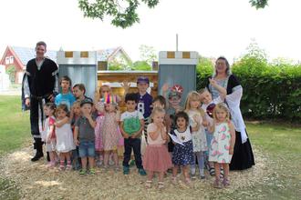 „In Alten-Buseck leben Ritter, die heißen hier: die Johanniter.“ Dieses lustige Ritternest-Lied (in dem auch Marco, die Maus vorkommt) haben die Kinder und Erzieherinnen gesungen, bevor sie in die verschiedenen Aktivitäten einstiegen. Rennen wurden auf bunten Pferden aus Schwimmnudeln ausgetragen, sich mit Schwertern aus Luftballons „bekämpft“ und Schilder mit Wappen entsprechend der Gruppen-Namen (Wölfe, Drachen und Burgmäuse) gestaltet. Im Erzähltheater Kamishibai lauschten die Kinder in einem Zelt gebannt der Geschichte von „Ritter Rost“. Die Eltern hatten für ein köstliches Buffet gesorgt.