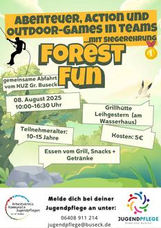 Am 8. August 2025 erwartet Kinder und Jugendliche zwischen 10 und 15 Jahren ein aufregendes Erlebnis im Rahmen des „Forest Fun“ Abenteuer- und Actiontages an der Grillhütte Am Wasserhaus in Leihgestern. Unter dem Motto „Abenteuer, Action und Outdoor-Games in Teams“ können die jungen Teilnehmerinnen und Teilnehmer in Gruppen spannende Aufgaben meistern, Teamgeist beweisen und gemeinsam Spaß haben. Los geht’s um 10:00 Uhr und die Veranstaltung endet mit der Siegerehrung um 16:30 Uhr.