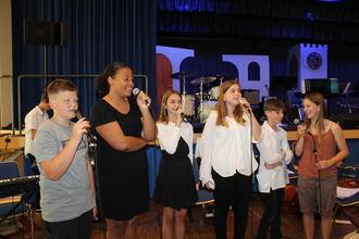 Die Wetter-Apps sagten für den frühen Donnerstagabend mal mehr und mal weniger Regen voraus. „Da ich weder nasse Kinder noch nasse Instrumente haben möchte, haben wir den Aufbau im Kulturzentrum vorgenommen,“ erklärte Musikschulleiterin Britta Lange. Die wenigen Besucher, die im Park verweilten, konnten bei geöffneten Türen dennoch das Programm verfolgen. Im Saal herrschte zeitweise Partystimmung. Das hoch erfreute Publikum, zumeist Angehörige der Schülerinnen und Schüler, ging voll mit und spendete heftigen Beifall. Zuletzt hatte sich an der IGS Busecker Tal eine richtige Band-Szene entwickelt. Neben der Bläser-Band 9/10 traten noch drei Band-AGs und zwei Schlagzeug-AGs auf. Zum Auftakt sang die „Find your voice - AG“. Dieser kleine Chor lieferte mit einem „4-Chord-Song-Medley“ von Country-Road über „No women no cry“ bis hin zu „Let it be“ eine text- und tonsichere Leistung ab. Dabei leuchteten in den hinteren Reihen die Taschenlampen der Handys von Mitschülern. Einige der jungen Gesangstalente interpretierten hiernach in den Bands ihre Songs in zungenbrecherischer Geschwindigkeit.