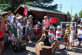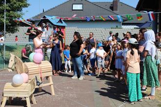 Einige der anwesenden Papas und Mamas waren schon in ihrer eigenen Kindergartenzeit mit Paule Puhmanns Paddelboot unterwegs. Nun konnten sie beim „Fest der Kulturen“ der Kita „Mäuseland“ in Trohe dabei zuschauen, wie ihre Kinder um die halbe Welt reisten und Kontakte zu Menschen anderer Länder knüpften. Text und Musik stammen von dem bekannten Kinderliedmacher Fredrik Vahle und passten wunderbar zu diesem Sommerfest „Es ist schön zu sehen, wie offen auch ansonsten Ihre Kinder aufeinander zugehen und sich verständigen. Ich wünsche mir, dass die Erwachsenen heute ebenfalls die Zeit nutzen um ins Gespräch zu kommen,“ sagte Kita-Leiterin Heike Müller-Mehlhos. Begrüßen konnte sie auch ihre Vorgängerin Gabriele Bandt, von der sie Ende Januar „eine gut strukturierte und funktionierende Kita und ein tolles Team übernommen hat.“ Die Eltern der 23 „Riesenmäuse“ bedankten sich im Namen der zukünftigen Grundschüler für die schöne Kindergartenzeit mit einem großen und einem kleinen Holzpferd für die Kids sowie einem Präsent bei den Erzieherinnen.