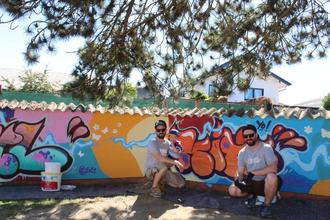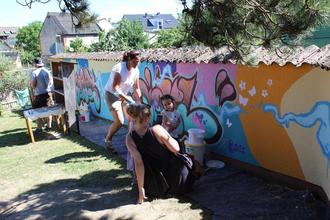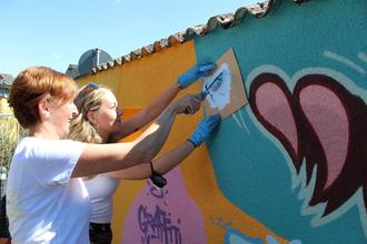 Für die wunderbare Gestaltung der Mauer waren die Gebrüder Krieger zwölf Stunden im Einsatz. Außerdem hatten die beiden Künstler Schablonen vorbereitet, so dass Kinder mit Unterstützung der Eltern oder Erzieherinnen beim kürzlich gefeierten Sommerfest die Möglichkeit hatten, das Kunstwerk mit kleinen Schmetterlingen und Blumen zu erweitern. Eine wirklich tolle Idee.