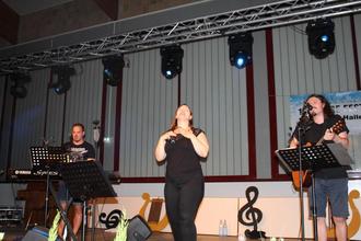 Auch das „Glanzlicht“ des Abends war ihr zu verdanken. Eingetaucht in Lichteffekte und Kunstnebel begeisterte Schmitz mit ihren stimmgewaltigen Freunden Henrik Stroh, Nadja Nachtigall und Yannik Bernsdorf mit einer Musical-Potpourri-Show vom Feinsten. Bei „Les Misérables“ und „Wie ich bin“ (Wicked) zeigten sie sich von ihrer ernsten Seite, bei „Summer Night“ aus „Grease“ romantisch im Text und rockig in der Musik. Das Ganze gipfelte in den „Rocky Horror Time Warp“ und die Aufforderung zum Mitmachen. Da ließ sich niemand lange bitten, wobei natürlich „jump to the left“ in den Stuhlreihen an den Tischen nicht so gut gelang. Dennoch ein Riesenspaß!