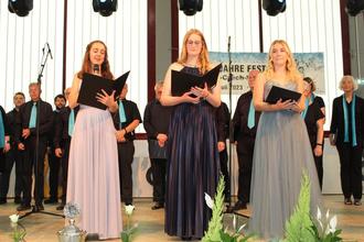 Mit einem Festabend wurde das 100-Jährige der „Bruderkette“ am Samstagabend gefeiert. Unter Beifall marschierten die Aktiven des Jubiläumsvereins in die Willy-Czech-Halle ein, verteilten sich großräumig und sangen gut aufgelegt zum Anlass: „Wir feiern heute mit Euch unser Jubiläum.“ Nach der Begrüßung durch die Vorsitzende Karin Diehl wünschte der Chor unter der Leitung von Verena Schmitz „Have a nice day (Lorenz Maierhofer) und zeigte sich beim Vortrag von „Baba Yetu“ in Swahili engagiert und dynamisch. Ein überzeugendes Tenor-Solo gab Henrik Stroh zu Beginn dieses „Lord’s Prayer“ von Ulrich Monthe. “Happy Birthday“, von allen Anwesenden gesungen, leitete über zum Prolog in Reimform der Festdamen Angelina Theiß, Danielle Woisin und Jasmin Henkel. Dabei gingen sie auf die Entwicklung des ursprünglichen Männerchors ein. Hier hieß es: „Im Laufe der Zeit wurde aus drei Chören wieder einer. Das Liedgut wurde moderner, daher war es an der Zeit: Der Chor Sonare stand dafür bereit.“ Mit ihm schaut der Verein, der nach der Gründung des Frauenchors 1972 insgesamt 92 Aktive hatte, zuversichtlich in die Zukunft. Wer tiefer in die Historie einsteigen wollte, konnte dies mit der kostenlos verteilten 68 Seiten starken Festschrift tun.