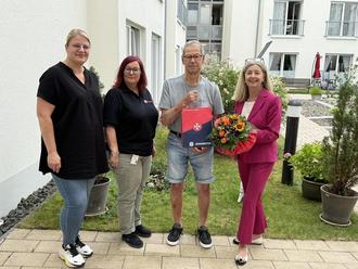 v.l. Anne Herröder, Einrichtungsleiterin des Johanniter-Stifts in Buseck, Ramona Nowaczyk, Bereichsleitung Notrufdienste JUH, 5000. Anschluss-Kunde Albert Reinheimer sowie Vertriebsleitung Notrufdienste, Angelika Rühl.