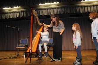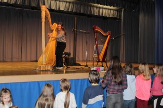 Anschaulich erläuterte sie den Aufbau: „Das Knie geht direkt in den Hals und dieser in den Bauch über.“ Ihren Versuch, das mit allerlei Verrenkungen auf den menschlichen Körper umzusetzen, erntete herzhafte Lacher. Sie demonstrierte den klanglichen Unterschied zwischen der kleinen (Anfänger-) Harfe zur großen Konzertharfe. „Die ist fast so schwer wie ich selbst,“ sagte sie.
