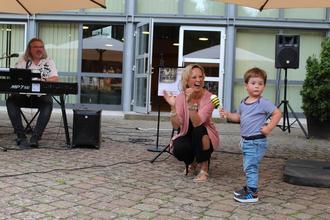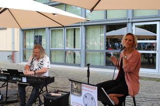 Ein großes musikalisches Vergnügen bereiteten M2Wonder, das sind Michaela Gans (Gesang) und Michael Gärtner (E-Piano), den weit mehr als 100 Gästen im Schlosspark. Mit strahlendem Gesicht, völlig unangestrengt, beeindruckte Michaela Gans mit einer emotionalen und starken Stimme. Im Publikum saßen etliche Familienangehörige und Freunde der Sängerin, die in Großen-Buseck zuhause ist. Jahrelange Auftrittserfahrung, zunächst als Leadsängerin einer Soul- und Funk-Combo, merkt man ihr an. Souverän im Auftritt, tonsicher und mit einer klangschönen Stimme intonierte sie „Bohemian Rhapsodie“ von Queen und „Bridge over trouble Water von Simon & Garfunkel. Emotionen nicht nur gesanglich herüberzubringen, sondern auch in Worte zu fassen, das ist ihre Leidenschaft. So hat sie sich als einfühlsame Rednerin zu Hochzeiten, Taufen, Geburtstagen und Beisetzungen bereits einen guten Namen gemacht. „Für immer ab jetzt“ (Johannes Oerding) und „All of me“ (John Legend) bieten sich für den „schönsten Tag im Leben“ geradezu an. Mit zart ausmodulierten Melodiebögen schmeichelte Gans auch ohne einen offiziellen Anlass den Ohren der Gäste. Vielleicht hätten einige Musikliebhaber die oft leise dahinschwebenden Töne am Ende der Liedbeiträge noch länger auskosten wollen, dem war der allzu schnell einsetzende heftige Applaus jedoch nicht zuträglich.
