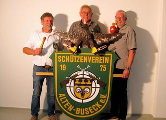 Das Zepter fiel mit dem 81. Schuss und somit wurde Erhard Mittler 1. Ritter. Nach weiteren 63 Schüssen, also dem 144. Schuss gesamt, ging auch der Reichsapfel zu Boden. Der glückliche Schütze war Andreas Weimer, der 2. Ritter wurde. Den Schnappritter sicherte sich nach weiteren 18 Schüssen Uwe Hofmann. Nach dem insgesamt 271. Schuss senkte sich dann kurz vor 22 Uhr der Adler Richtung Hallenboden. Der Schütze des alles entscheidenden Schusses war das Gründungsmitglied des Schützenvereins Alten-Buseck, Günter Schmidt, der somit die „Krone“ im Jubiläumsjahr bereits zum 3. Mal trägt. Unter großem Hallo und mit Glückwünschen aller Anwesenden übergab Burkhard Hofmann die Königskette an seinen Nachfolger.